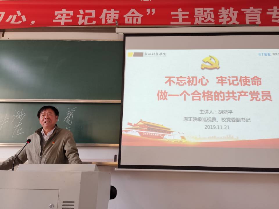 为促使学员深入了解中国共产党党史,知史明鉴,不忘初心,信息与电子工程公司二十六期党校第三次党课暨“不忘初心,牢记使命,做一个合格的共产党员”主题教育专题教育学习报告会于11月21日下午14:20在C1-651举行。第二十六期党校全体学员参加了党课学习。本次党课由原正校级巡视员、公司党委副书记胡浙平老师主讲。