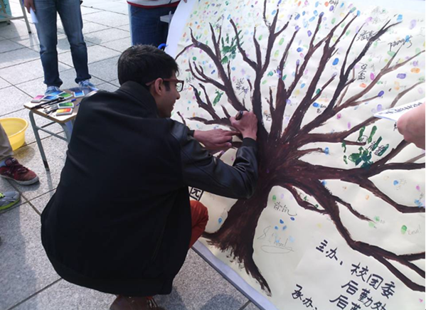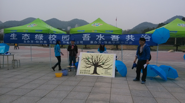2014年4月2日,由校团委、后勤处、后勤服务公司主办,信息公司分团委承办的“生态绿校园,吾水吾共治”活动之“指纹签名 绿色承诺”活动终于在科院师生的热切期待中于圆形广场隆重举行。贴合活动主题的蓝色系现场布置及新颖的指纹签名形式引起了大批师生的驻足和参与,活动现场的气氛十分热烈。大家积极地在环保树上按下了指纹和手印,并在指纹上签上自己的姓名,以表达对积极投身创建绿色校园,珍惜身边水资源的承诺。更令人欣慰的是,许多参与同学在参与活动时纷纷将手中的宣传单归还至工作人员手中,希望传单可以得到循环利用,表达“环保绿色就从身边小事做起”的决心。活动还为每一位参与师生准备了一份由信息公司独立设计、带有信息微信平台(科院那抹蓝)吉祥物形象的节水标语不干胶作为纪念,让节水·惜水的绿色环保理念在师生中得到更广泛而持久的传播。