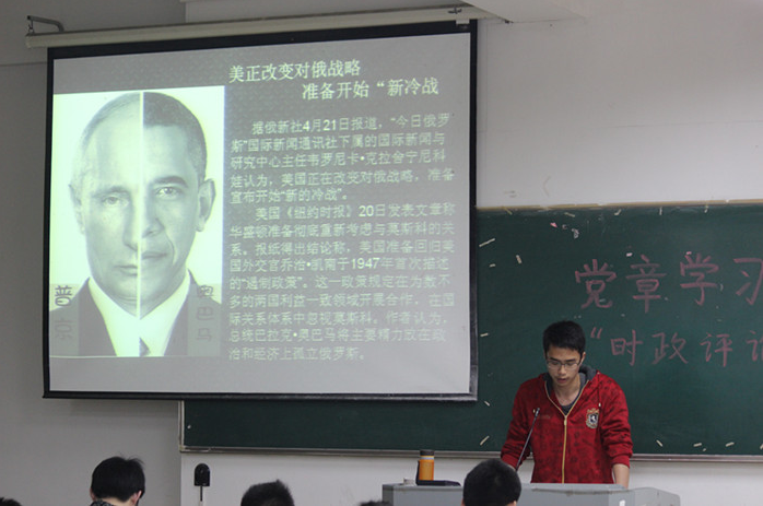 2014年4月27号晚六点半,在A2—118教室,信息公司中研会学术部举办了党章学习小组第二次活动——时政评论。