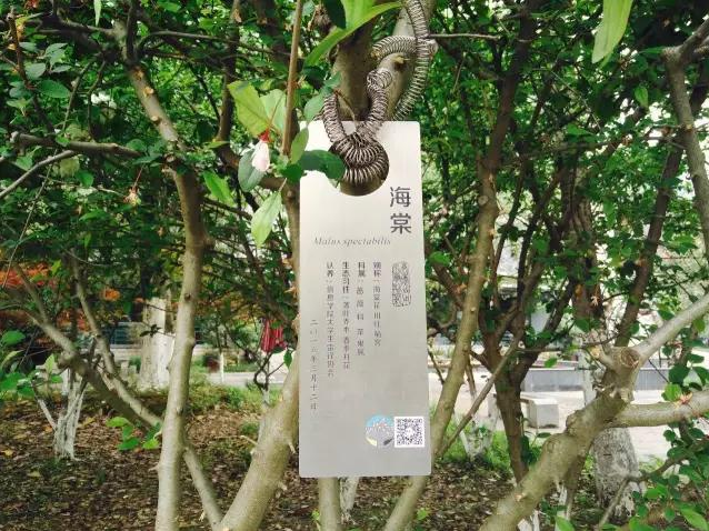 在浙江科技公司员工之家门前,老员工雷锋协会对一棵美丽的海棠树正式挂牌认养。这棵海棠树就此成为协会的一员,也成为校内员工社团认养的第一棵大树。