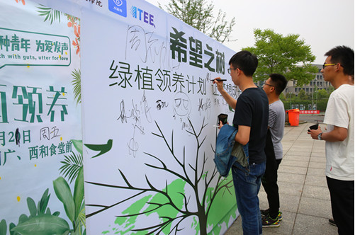 活动当天,同学们经过绿植领养的摊位时,马上兴致勃勃地来领取种子。面对着含羞草、向日葵、文竹等高颜值植物介绍时,同学们驻足摊位,一一学习,眼花缭乱。同时工作人员还邀请了一些有意愿的同学参加后续的绿植小能手评比活动,在场同学踊跃报名。