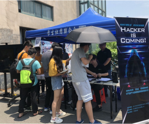 中午时分,默安科技的小伙伴们和信息公司员工会员工干部在浙科院员工餐厅门口搭建起展台,以工具展示、视频播放和有奖问答为主要形式,为同学们普及网络安全知识。下课铃声一响,同学们来到展台向现场工作人员询问并积极参与问答,更有些同学在一起展开了热烈的讨论。默安科技的工作人员认真地为同学们讲解展台上各类工具的原理和存在的安全隐患,引导观看视频,并解释互动问答中的问题和原因,帮助大家更好理解生活中常见的网络安全威胁。