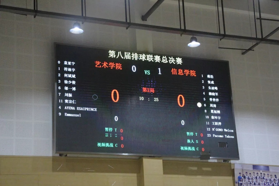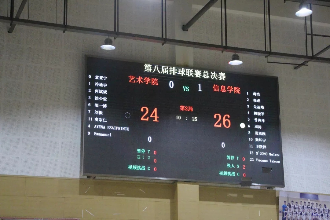 此时,信息公司战术性喊出换人,希望借此打破僵局。显然信息公司的战术十分正确,换人之后的连续得分,使得我们取得主动权,但艺术公司仍紧追不舍!比分来到了24:24达到赛点,信息公司率先扣得第1分,最后8号葛旭刚精准的拦网,以26:24的比分险胜!