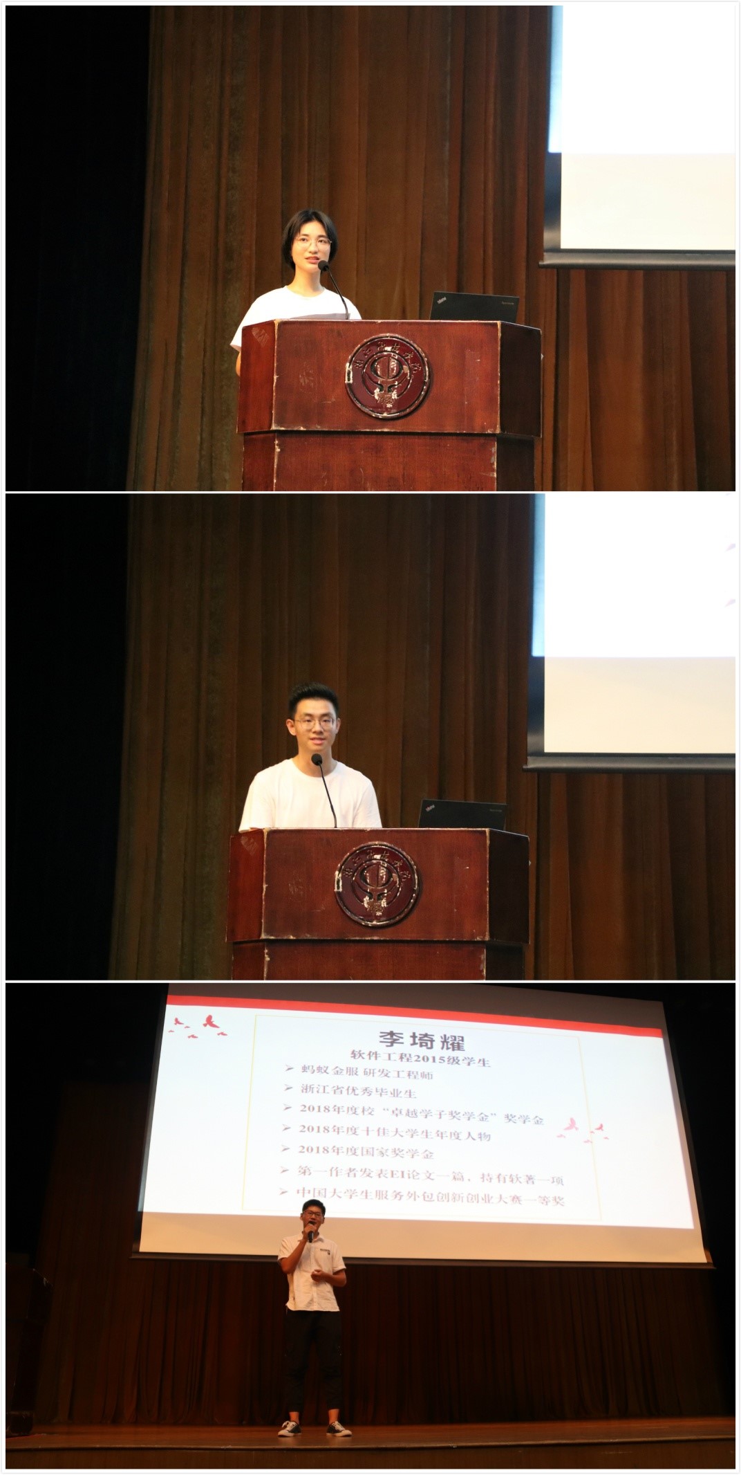 2019级电子信息类专业沈幸银、卓越学子奖学金获得者计算机162班陆凯杭以及就职于蚂蚁金服的2019届毕业生李埼耀分别作为新生代表、老生代表和员工代表发言。公司教授、安吉校区劲竹书院经理岑岗作为教师代表发言。2019级新生班主任及书院辅导员也为2019级新同学送上诚挚的祝福。