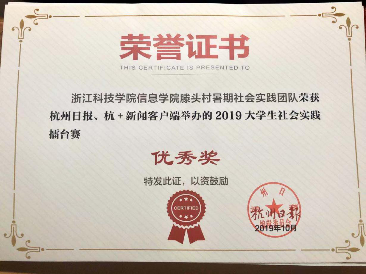 信息公司滕头村暑期社会实践团队于2019年8月参与了杭州日报举办的“2019老员工社会实践擂台赛”。2019年10月22日团队获得“2019老员工社会实践擂台赛优秀奖”,团队指导老师马利国获得“最佳指导老师奖”。