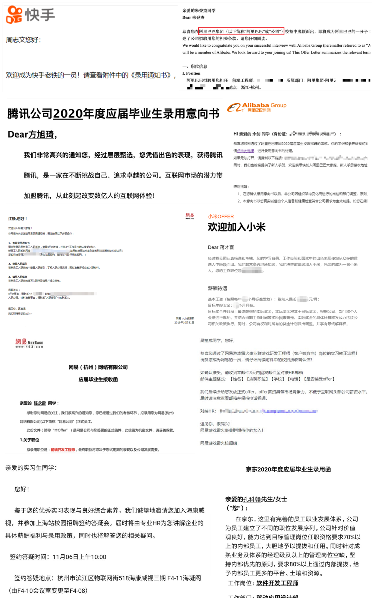 受疫情影响,当前就业工作面临诸多挑战。信息公司党委高度重视毕业生就业工作。成立公司就业领导小组,完善公司就业奖励制度;精细摸排公司毕业生就业情况,分类开展多种形式的线上指导;积极配合招就处开展线上招聘会,不断拓展就业信息渠道,发动教师员工资源,及时为毕业提供就业信息;以生为本,开学前积极为毕业生提供便利服务。截止目前,信息公司2020届累计近20名毕业生已经收到阿里、腾讯、网易、海康、京东、小米、快手、联通、大华、中控等一线互联网公司的offer并入职。