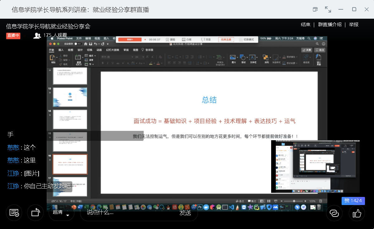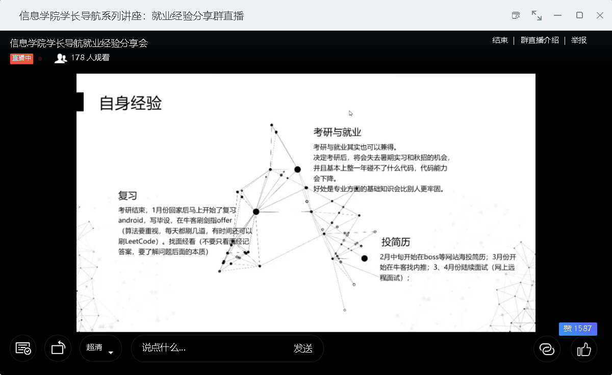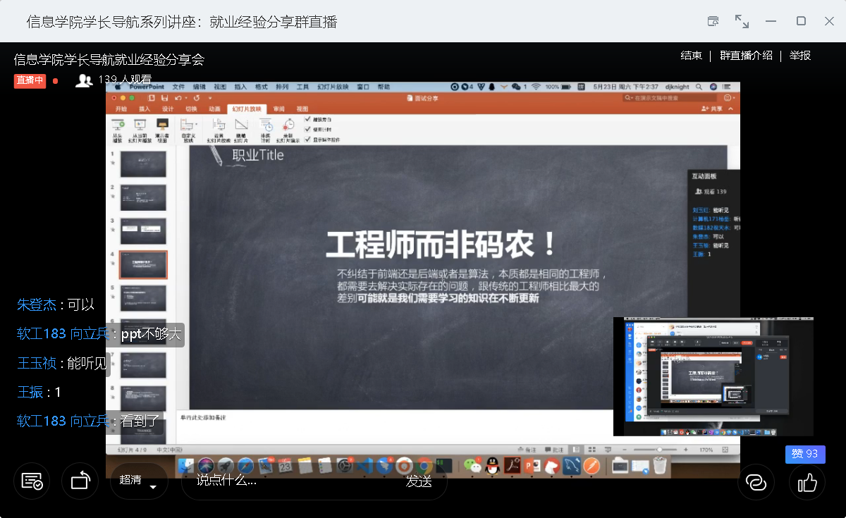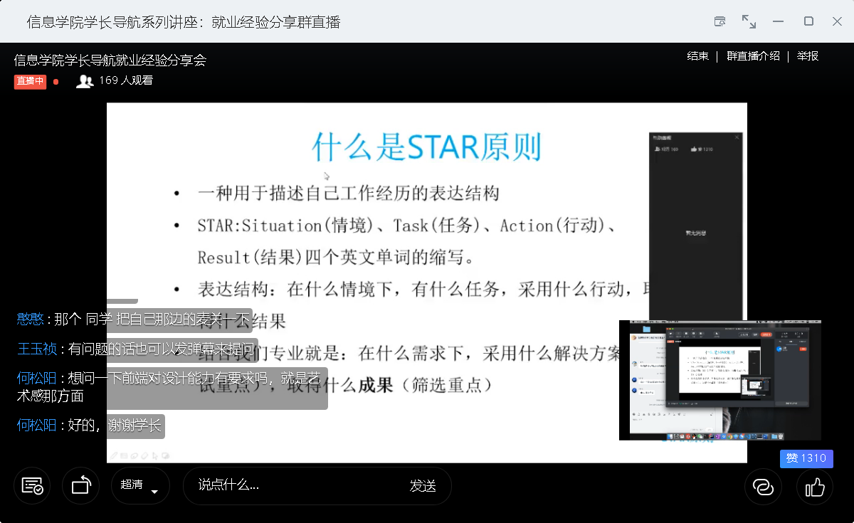 为全面做好2020年就业工作,进一步帮助在校员工更好的确立未来发展目标和方向,为员工就业提供有利的指导和帮助,并结合大三年级员工的实际需求,公司于5月23日下午14点30分举办了线上就业经验分享会。信息公司18级辅导员谢超凡老师,以及各年级同学180余人参加了本次讲座。