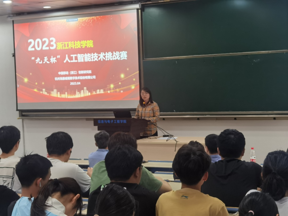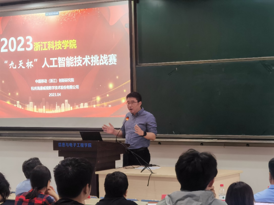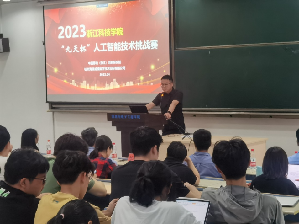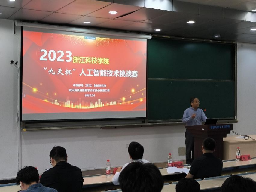 2023年4月18日,赛事启动仪式暨赛题发布会召开,信息公司、电气公司、理公司等相关专业教师与员工近200人参会,安吉校区部分员工通过视频会议方式参加。教务处副处长刘洪民代表公司对竞赛的举办表示欢迎,感谢合作企业的大力支持,并介绍了公司对学科竞赛的政策支持以及近年来所取得的成绩。信息与电子工程公司书记张蕾肯定了企业命题对锻炼员工应用创新能力的重要作用,希望今后能够进一步深化多种形式的校企合作,鼓励员工积极参加竞赛,预祝取得好的成绩。中国移动(浙江)创新研究院副经理蒋健重点介绍了本届“九天杯”人工智能技术挑战赛的相关信息,并分享了中国移动九天・毕昇平台为高校师生所提供的人工智能领域的课程学习、竞赛、科研、求职、教学等一站式云端服务。海康威视杭州分公司郭兴锋总监介绍了公司二十年来的发展历程与在新时代背景下公司的转型,并邀请员工未来能够加入海康威视。