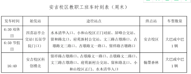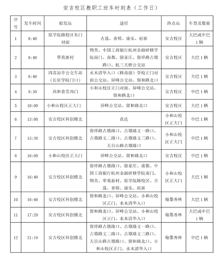 根据公司教学安排,2020年5月25日起安吉校区开始全面线下上课,教职工班车同步恢复正常运行(每周日下午16:00由西和食堂西门出发至安吉的应急班车5月24日开始正常运行,周一上午7:00由科创楼返回小和山),具体安排如下: